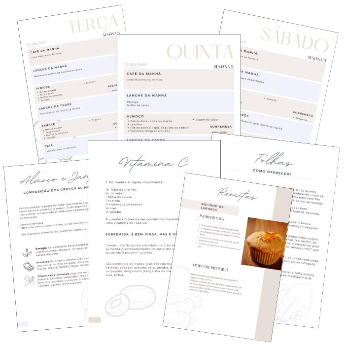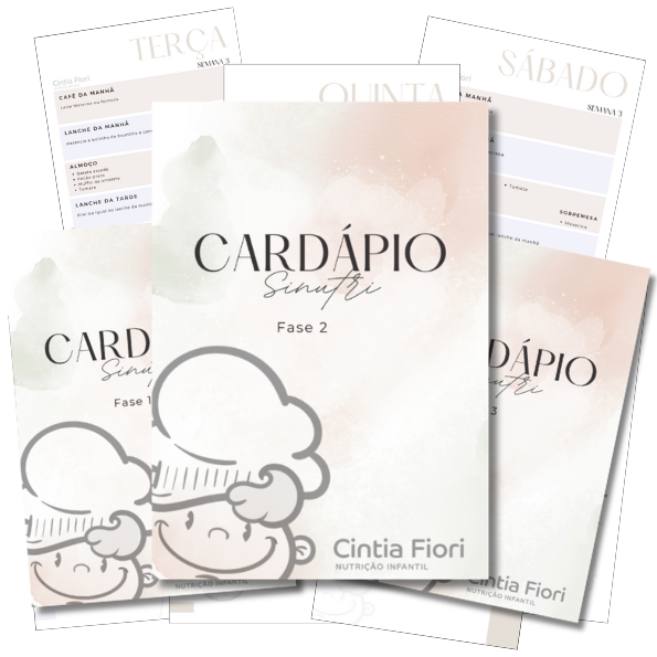 Cardápios desenvolvidos pela Dra. Cintia Fiori para ajudar mães a conduzirem a introdução alimentar com segurança, variedade e organização, sem improviso.